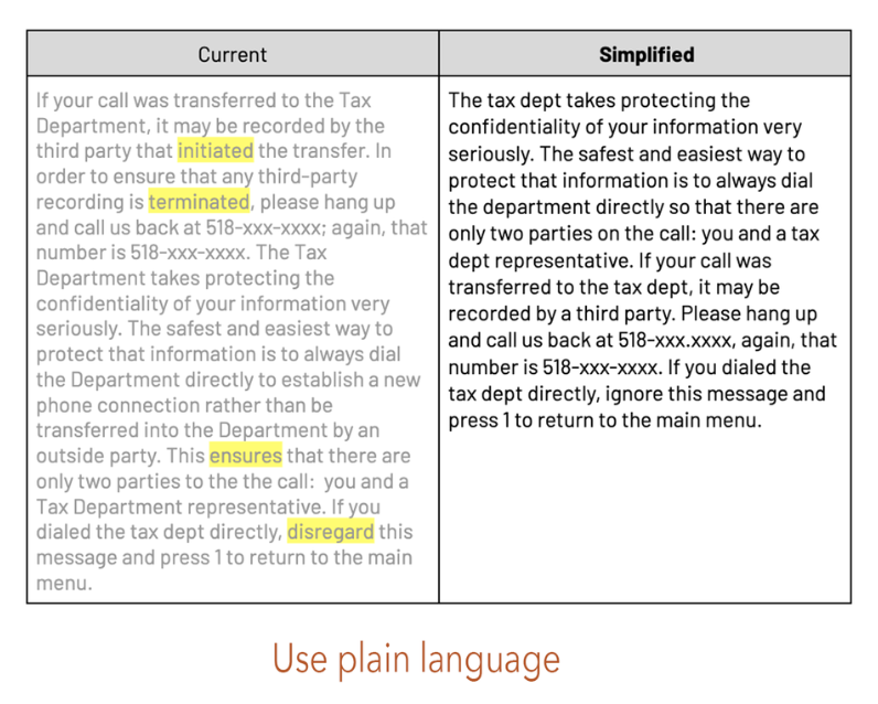To improve equity, accessibility, and comprehension of the automated phone support, a heuristic evaluation was completed with an emphasis on following plain-language guidelines.