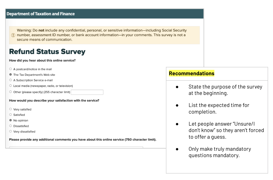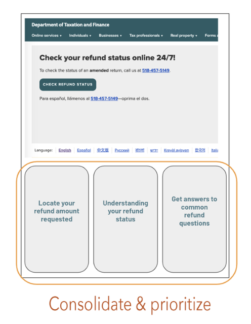 NY state issues over 7 million tax returns annually, and many find the process difficult and frustrating. Leveraging UX writing and design best practices, improve the self-service tax refund resources for constituents within a four-month timeline and engineering constraints.