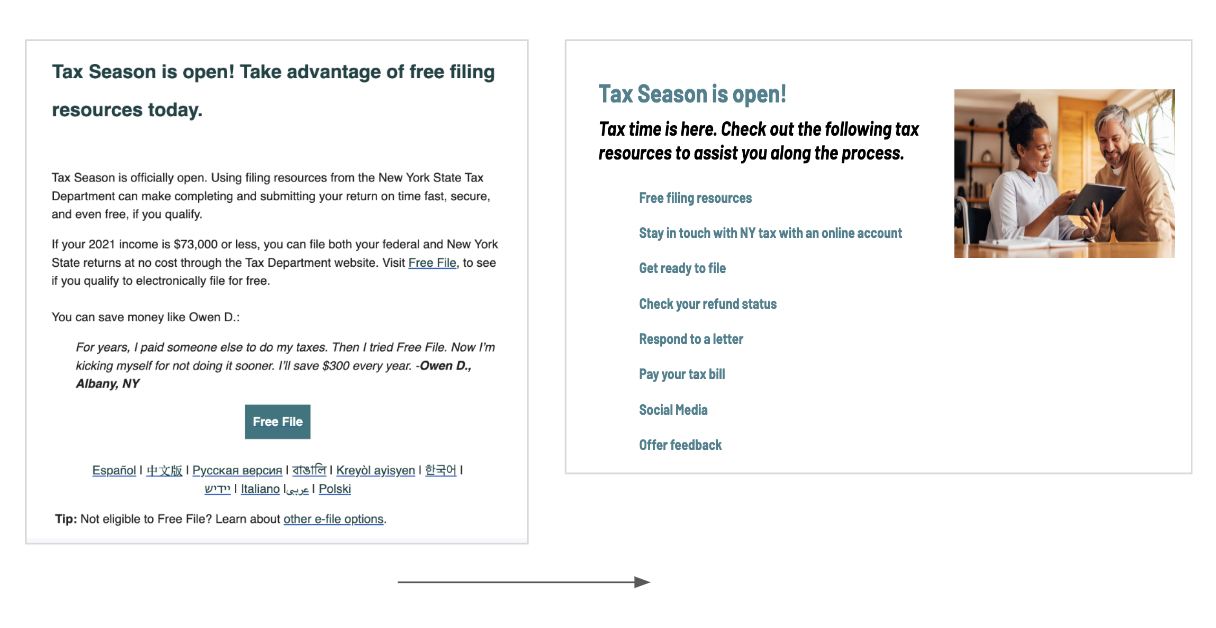 Previously, taxpayers needed to scan a long tax season email to find the information that pertained to them. The evaluation recommended that the information be reorganized in a natural and logical order, with section headers to help taxpayers accomplish their key tasks. A reformatted email was sent to millions of taxpayers based on these recommendations.